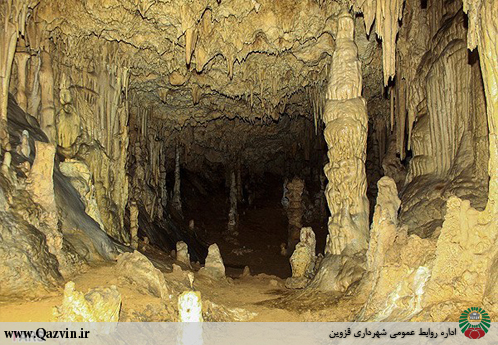 The cave is located in distance of 20 km from Khareqan twin towers in Hesar village, Abyek town with geographical coordinates 30/51/48 east longitude and 54/47/35 north latitude,about 2064 meters above the sea level . After passing the cave and descent from a15 -meter well, a hall would appear with an area of one thousand square meters , which has beautiful stalactites. Its oldness back to Alygumios period and third periods of geological that it is estimated forty million years ago .